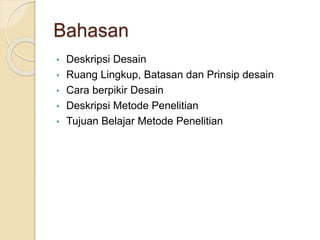 Dokumen tersebut membahas tentang metode penelitian dalam desain, yang mencakup penjelasan tentang ruang lingkup desain, prinsip-prinsip desain yang berfokus pada manusia, dan cara berpikir desain yang didasarkan pada penelitian dan prototyping. Dokumen ini juga menjelaskan manfaat penggunaan metode penelitian bagi desainer untuk memecahkan masalah secara sistematis dan objektif.