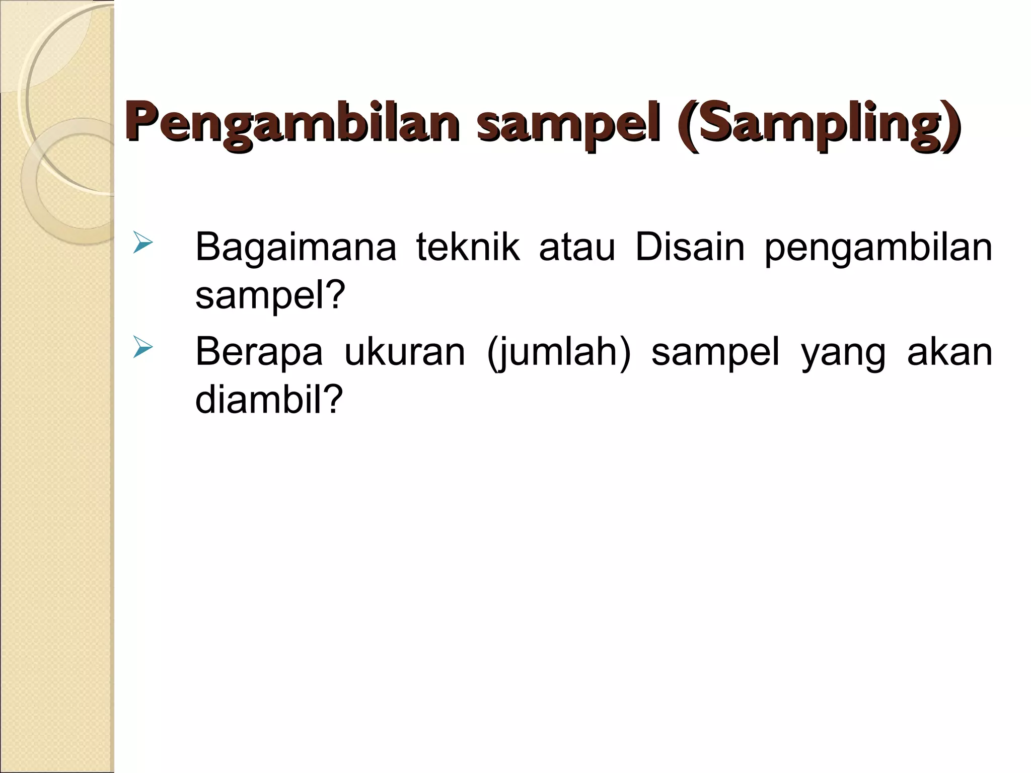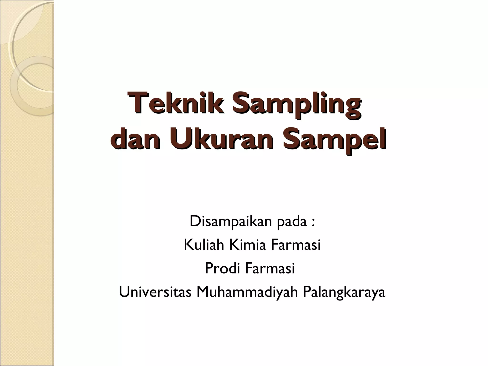 Teknik sampling dan ukuran sampel merupakan topik penting dalam melakukan penelitian. Ada beberapa teknik sampling seperti random sampling dan non-random sampling yang dapat digunakan tergantung tujuan penelitian. Ukuran sampel yang tepat perlu ditentukan berdasarkan karakteristik populasi dan tujuan penelitian untuk memperoleh hasil yang representatif dan valid.
