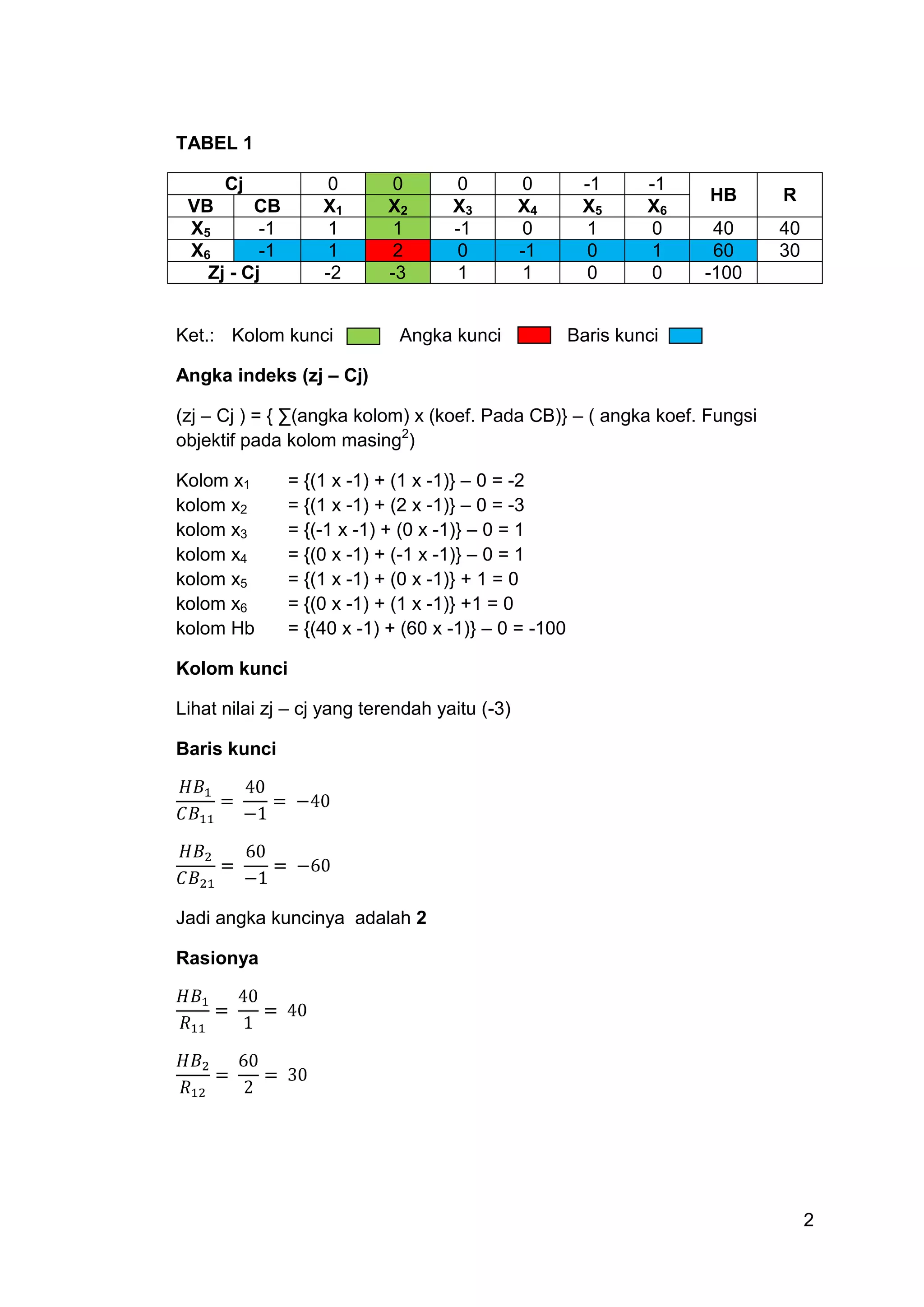 Dokumen ini membahas metode dua fase dalam optimasi, yang melibatkan pengoptimalan variabel keputusan dalam dua tahap. Fase pertama menggunakan variabel buatan dan menentukan koefisien harga dalam fungsi tujuannya, sedangkan fase kedua melanjutkan dari tabel akhir fase pertama dengan koefisien asli. Contoh penyelesaian dengan fungsi tujuan dan kendala diperlihatkan, yang menunjukkan bahwa nilai minimum z* yang dicapai adalah 1400.