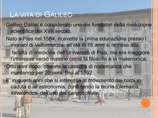 Galileo Galilei, nato nel 1564, è considerato uno dei fondatori della rivoluzione scientifica del XVII secolo grazie al suo metodo sperimentale, che ha innovato l'approccio all'indagine scientifica. Questo metodo si basa sull'osservazione, misurazione e replicabilità degli esperimenti, confermando o rivedendo le ipotesi formulate. La sua rivoluzione ha superato le idee aristoteliche, promuovendo un'analisi della natura attraverso misurazioni e esperimenti piuttosto che solo ragionamenti astratti.