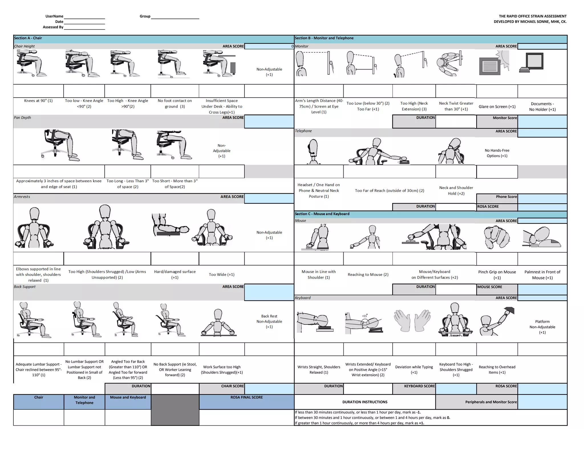 This document contains a scoring sheet for assessing office ergonomics risks called the Rapid Office Strain Assessment (ROSA). It evaluates various areas of a workstation setup including the chair, monitor, telephone, mouse, keyboard and other peripherals. Scores are given in each area and then combined using charts to determine an overall ROSA score. A high score indicates higher ergonomic risk and need for adjustments to reduce strain. Guidelines are provided on how to use the various sections and combine the scores to evaluate ergonomic risks and identify areas for improvement.