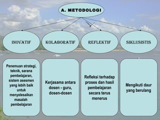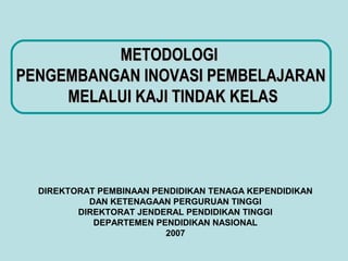Dokumen ini menjelaskan metodologi pengembangan inovasi pembelajaran melalui kaji tindak kelas yang melibatkan kolaborasi antara dosen dan guru. Proses ini mencakup identifikasi masalah, analisis, perencanaan tindakan, pelaksanaan, observasi, dan refleksi untuk perbaikan berkelanjutan. Tujuannya adalah untuk meningkatkan kualitas pembelajaran dengan strategi yang lebih baik dan inovatif.