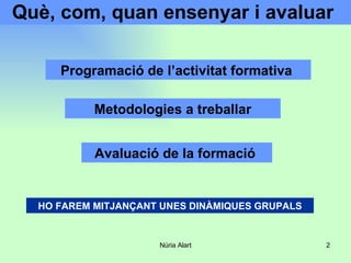 Què, com, quanensenyar i avaluar Programació de l’activitat formativa Avaluació de la formació Metodologies a treballar HO FAREM MITJANÇANT UNES DINÀMIQUES GRUPALS