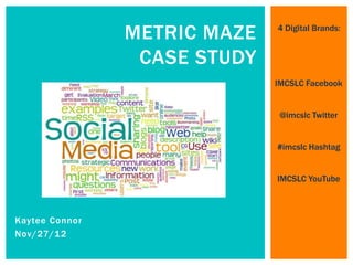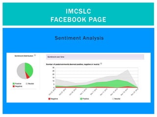 The document analyzes the digital brand presence and metrics of IMCSLC across 4 platforms: Facebook, Twitter, hashtag, and YouTube. It provides data on sentiment, influencers, volume, and content for each platform, finding mostly positive sentiment and high student/teacher participation on Facebook. Benchmark analysis found no direct competitors on these channels.