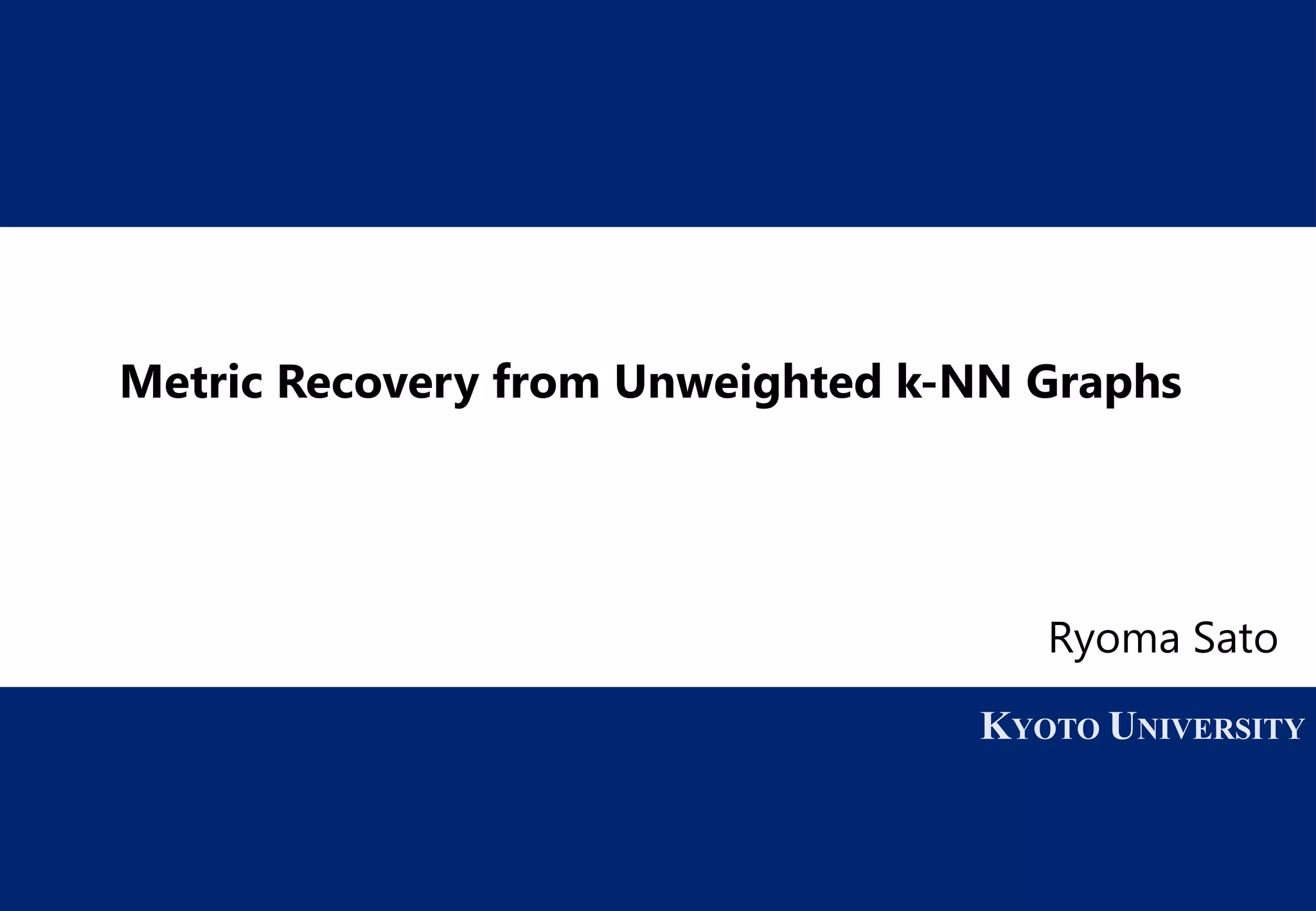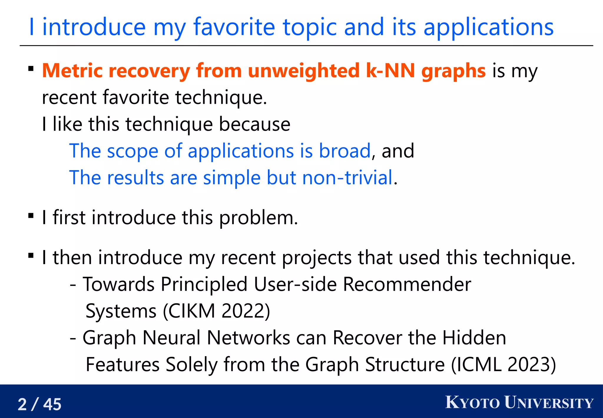 The document discusses metric recovery from unweighted k-nearest neighbor (k-nn) graphs, highlighting its applications in user-side recommender systems and graph neural networks (GNNs). It outlines the challenges in estimating the latent coordinates from the k-nn graphs and presents a systematic approach to address these difficulties, including the importance of edge lengths and densities. The findings suggest that GNNs can successfully recover hidden features from graph structures, even with uninformative input features.
