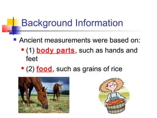 The document discusses measurements and metrics. It provides background on ancient measurement systems based on body parts and food grains. It then summarizes the modern metric system devised in the late 18th century to have a single, unified, decimal-based system for use around the world. Key details include that the metric system is based on powers of 10, making conversions easier by moving the decimal point. The metric system is now used internationally, with only three countries still using other systems.