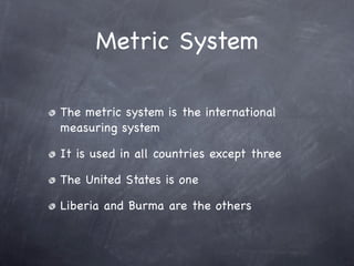 The metric system is the international standard system of measurement used in nearly all countries. The United States, Liberia and Burma are the only exceptions. Volume is the space inside a three-dimensional object defined by its length, width and height, calculated by multiplying those dimensions. The standard metric unit for volume is the liter, which most people recognize as a measurement for soda, such as two-liter bottles.