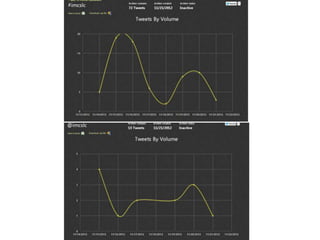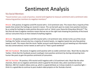 The document analyzes social media metrics for the IMC SLC program across Twitter, Facebook, and YouTube. It finds that while sentiment is mostly neutral, there is room to increase positive sentiment by posting more conversational content. Influencer analysis reveals top influencers who could help promote the program more. Volume analysis shows peaks that could be leveled out. Content analysis examines popular keywords relating to program activities. A benchmark analysis found IMC SLC to have more active social media presence than comparable programs.