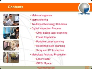 Metris is a leading provider of metrology solutions, offering both traditional and digital inspection technologies. It has a global presence with offices worldwide and over 500 employees. Metris aims to improve customers' processes through innovative metrology solutions and offers the most complete portfolio of products, including coordinate measuring machines, laser scanning systems, X-ray and CT, and solutions for metrology-assisted production.
