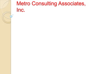 Metro Consulting Associates provides IT staffing solutions and services. They have a large pool of W2 employees and consultants across various technology domains that allows them to quickly fulfill clients' staffing needs. Their nearly 100% client retention is due to their responsiveness, quality of talent, and long-standing client relationships built on delivering value. Metro has experience supporting Fortune 500 companies and is capable of meeting all IT hiring needs through direct placement of W2 employees or contract consultants.