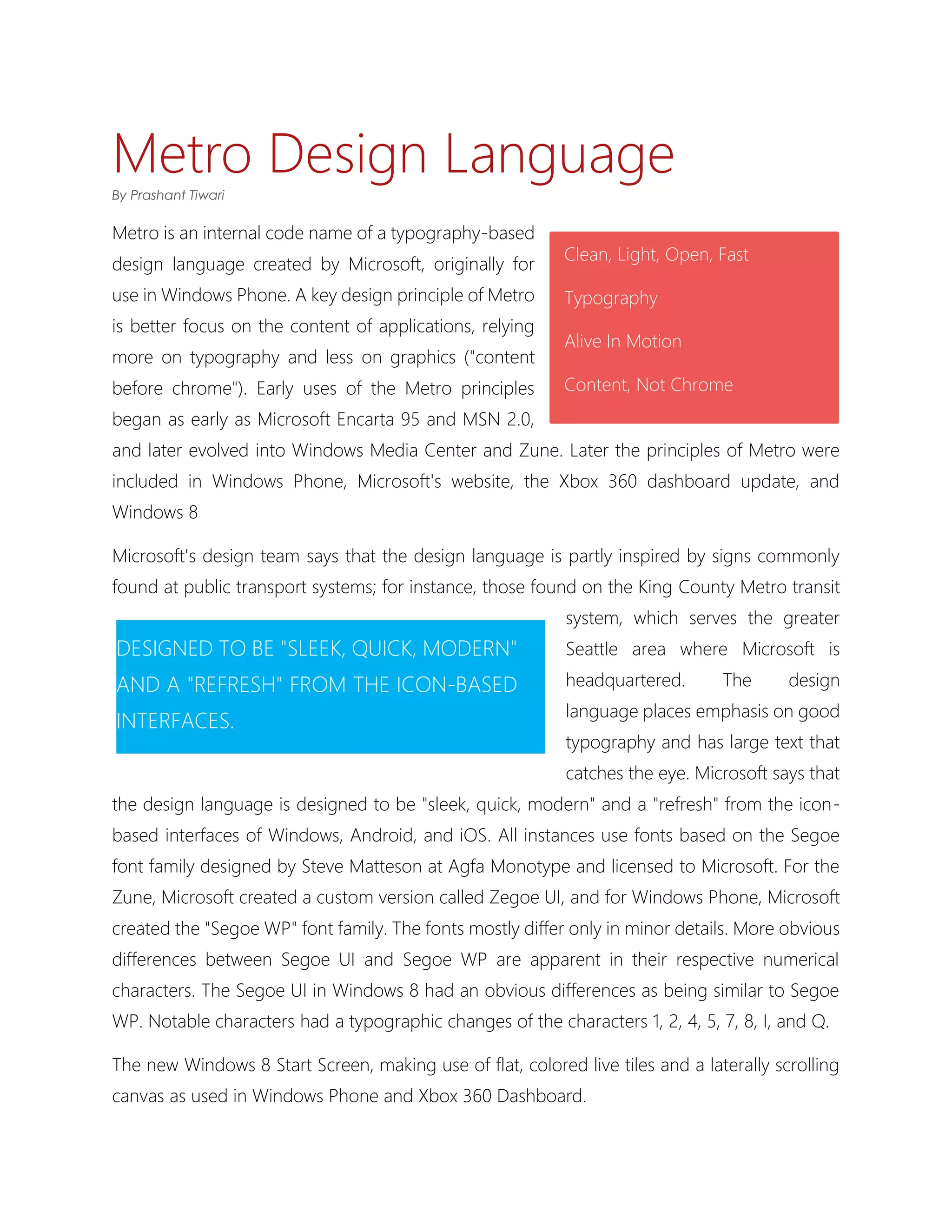 Metro is a design language created by Microsoft originally for Windows Phone to emphasize typography over graphics. Key principles include putting content first, relying on animation and motion, and focusing on large text for quick comprehension. Inspired by public transit signage, Metro aims to be sleek, modern, and a refresh from icon-based interfaces. It was later applied to additional Microsoft products and platforms like Windows 8 to consolidate common tasks and favor larger interactive hubs over smaller buttons through lateral scrolling and exclusion of unnecessary visuals.