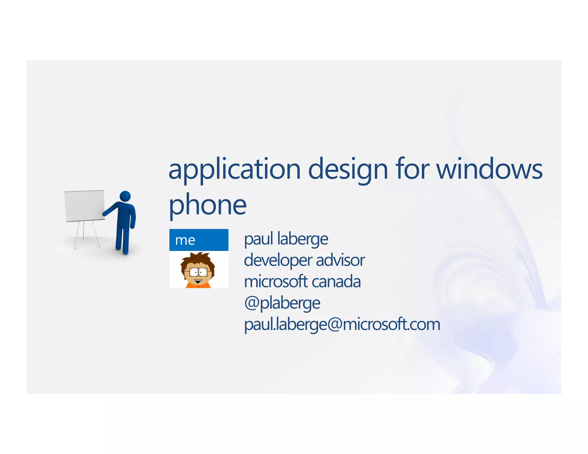 The document discusses best practices for designing applications for Windows phones using the Metro design philosophy. It covers principles like clean and minimalist design, using typography and white space to guide users. Specific guidelines addressed include a hub and spoke navigation model, avoiding confusing elements, and designing for touch. The document emphasizes making the interface intuitive so users can accomplish their goals with ease.