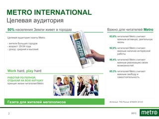 Газета Metro является ведущим городским изданием с высокой аудиторией и тиражом в крупных мегаполисах России, включая Москву и Санкт-Петербург. Целевая аудитория включает активных жителей возрасте от 20 до 54 лет с высоким достатком и образованием. Metro развивает мультиформатный подход, предлагая как печатные издания, так и онлайн-ресурсы.