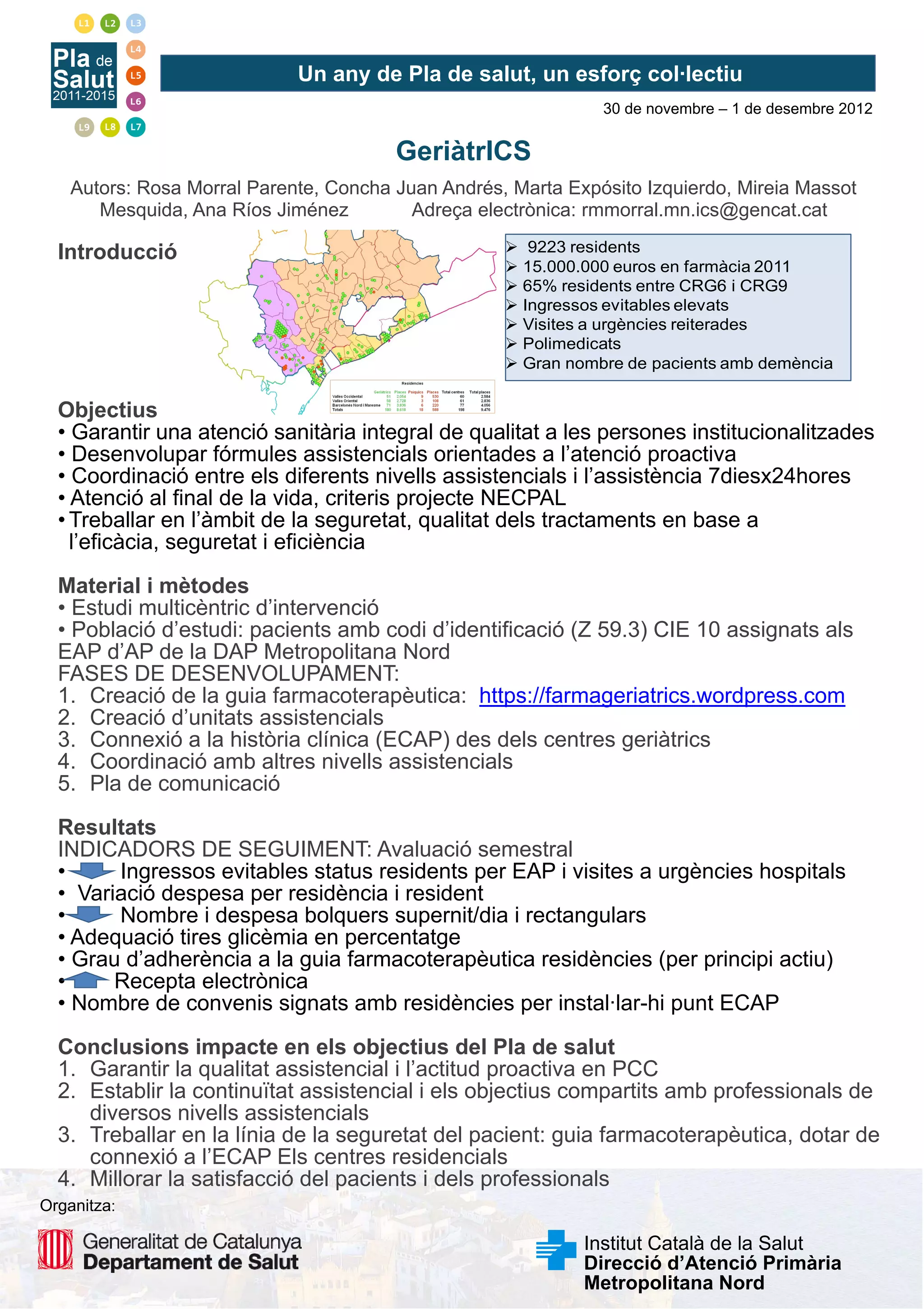Garantir una atenció sanitària integral de qualitat a les persones institucionalitzades, desenvolupar fórmules assistencials orientades a l’atenció proactiva, coordinar entre els diferents nivells assistencials i l’assistència 7diesx24hores, donar atenció al final de la vida, criteris projecte NECPAL i treballar en l’àmbit de la seguretat, qualitat dels tractaments en base a l’eficàcia, seguretat i eficiència