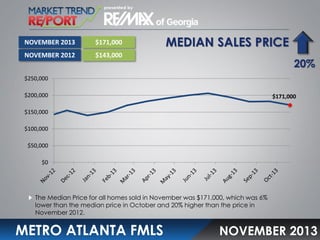 The document summarizes real estate data for the Metro Atlanta area in November 2013. It reports that the median home sales price was $171,000, a 20% increase from November 2012. Closed home sales transactions decreased 12% compared to the previous November. The average days on the market was 59 days, 15 days less than November 2012. The months supply of inventory was 4.0 months, a 23% decrease from November 2012.