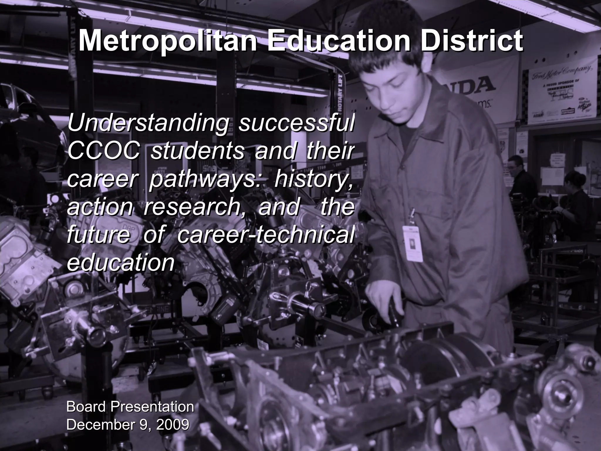 This document summarizes the history of career and technical education (CTE) in the United States and discusses current issues and the future of CTE. It traces the evolution of CTE from the 19th century through various acts that funded vocational programs up to the modern debate around CTE and ensuring students are both career and college ready. The document also notes challenges for CTE, such as inadequate funding and the perception of CTE as a "second class" option compared to a college preparatory track.