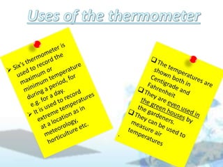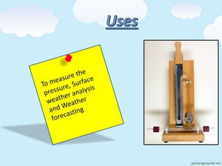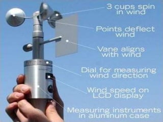 The document discusses various meteorological instruments used in weather forecasting, including thermometers, barometers, anemometers, and hygrometers, along with their functions and applications. It includes detailed descriptions of instruments' operational principles, such as the mercury barometer and aneroid barometer, and how they measure atmospheric pressure. Additionally, it highlights the importance of accurate measurements in meteorology and the use of innovative tools like all-sky cameras for observing weather conditions.