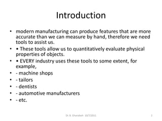 This document provides an overview of engineering metrology and linear measurements. It defines key terms related to dimensional metrology and discusses common measurement tools like scales, calipers, micrometers, and dial indicators. Scales are limited by human error while calipers and micrometers provide more precise linear measurements through vernier or thread mechanisms that magnify small movements. The document also covers measurement best practices and factors that influence tolerance and repeatability.