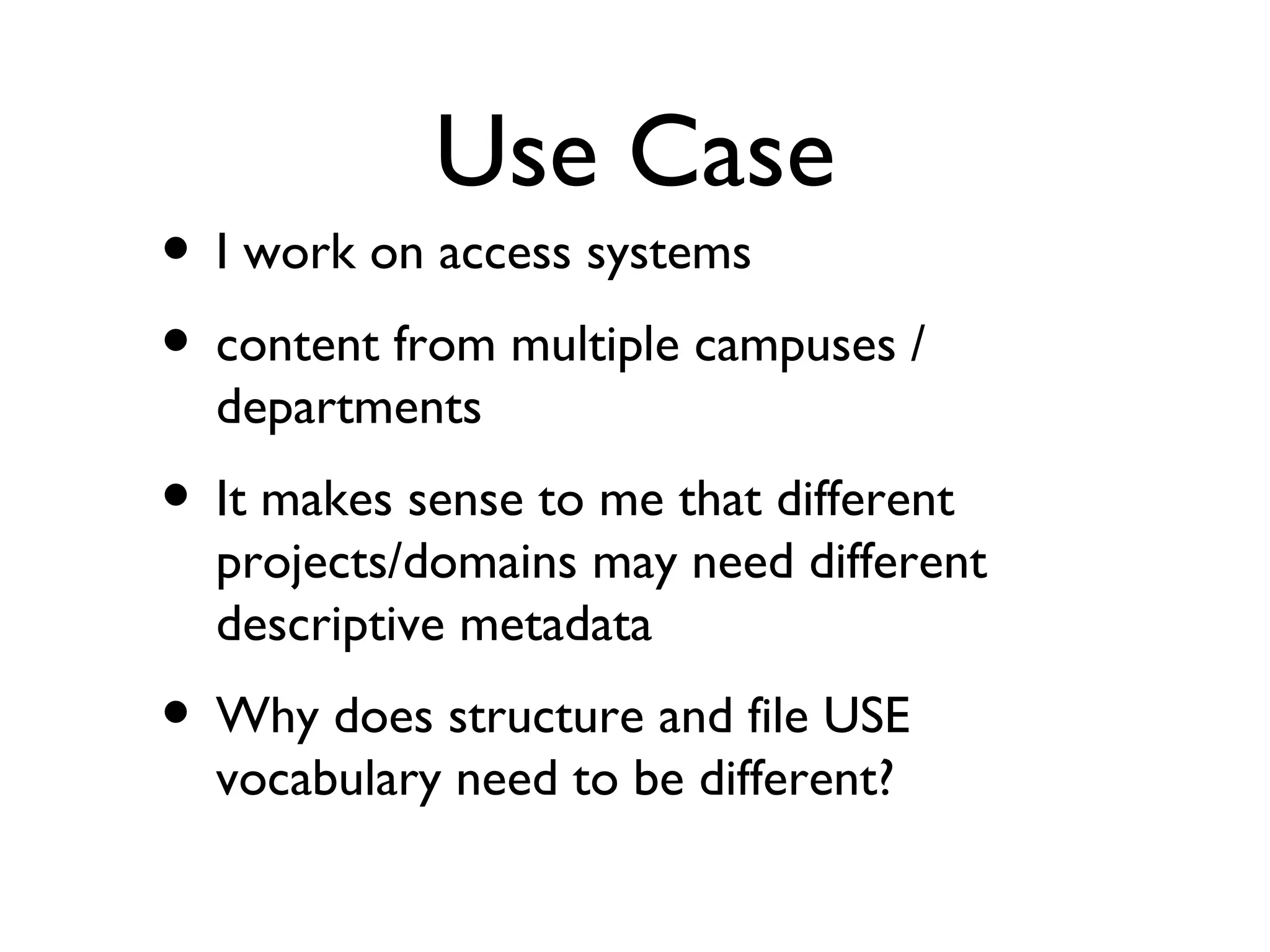 The document discusses metadata standards for encoding and transmitting content from multiple campuses and departments. It proposes developing a simplified object model that is separated from serialization formats and standardizing a common "USE" vocabulary for digital library use cases. Optional extensions could then incrementally add more complexity based on actual use cases. Some related experiments exploring this approach are referenced in a URL.