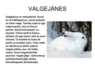 VALGEJÄNES Valgejänes onmetsaelanik. Suvel on ta hallikaspruun, ainult sabaots on üleni valge. Talveks saab ta aga valge kasuka, mis on tihe ja pehme. Ainult kõrvaotsad on mustad. Talvel närib ta haava-, pihlaka või paju koort, oksi ja noori võrseid. Ta kraabib ka lume alt pohla- ja mustika varsi. Toitu otsib ta videvikus ja öösiti, päeval magab põõsa, puu või mätta varjus. Enne magamiskohta asumist “segab jälgi”, teeb kahe-ja kolmekordseid jälgi, järske Kõrvalhüppeid- jänesehaake.