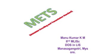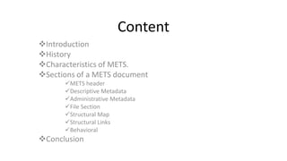 The document discusses the Metadata Encoding and Transmission Standard (METS), which is an XML schema for encoding metadata to manage and exchange digital objects between repositories. It provides an overview of the history and development of METS. The key components of a METS document include a header, descriptive and administrative metadata, a file section, and a required structural map which outlines the hierarchical structure and links files and metadata.