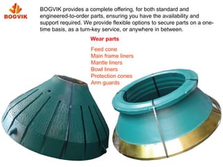 Bogvik provides high-quality replacement parts for Nordberg® MP1000 cone crushers, ensuring proper fit and function to reduce maintenance and increase equipment longevity. Their TIC (titanium carbide) insert crusher liners offer 2-3 times the lifespan of standard manganese liners, improving efficiency and minimizing downtime. Bogvik offers flexibility in part acquisition, catering to various customer needs while enhancing performance and cost-effectiveness.