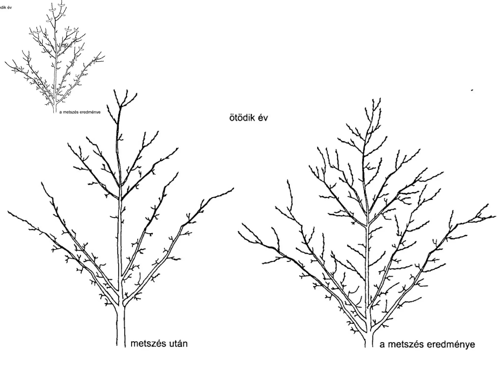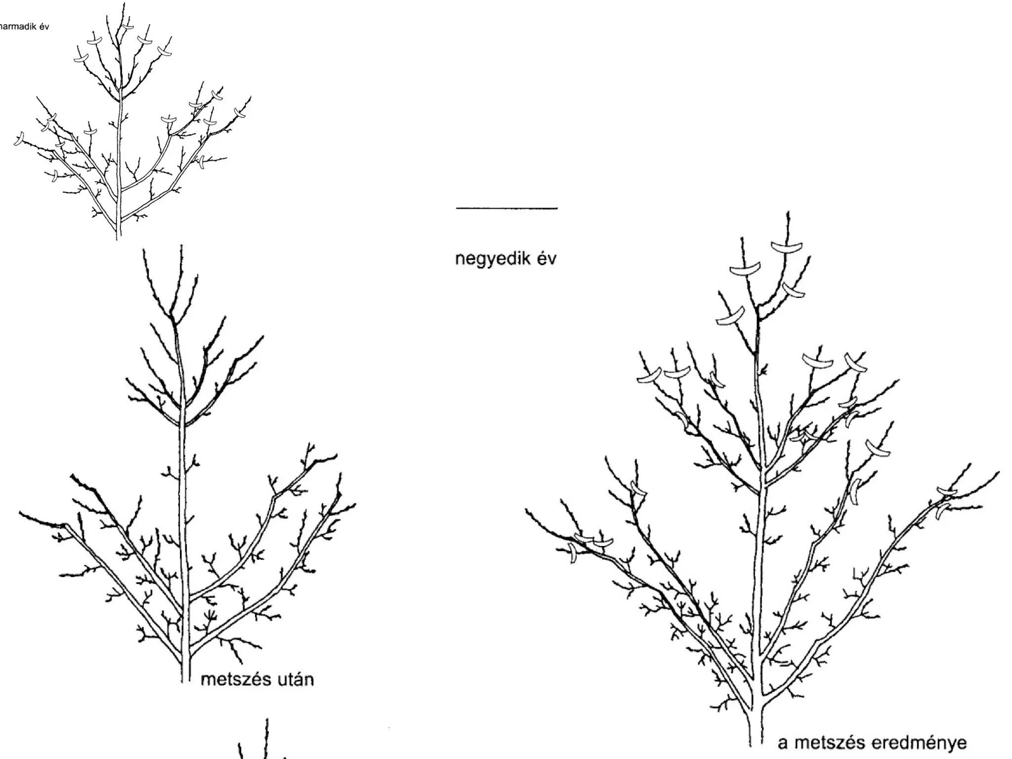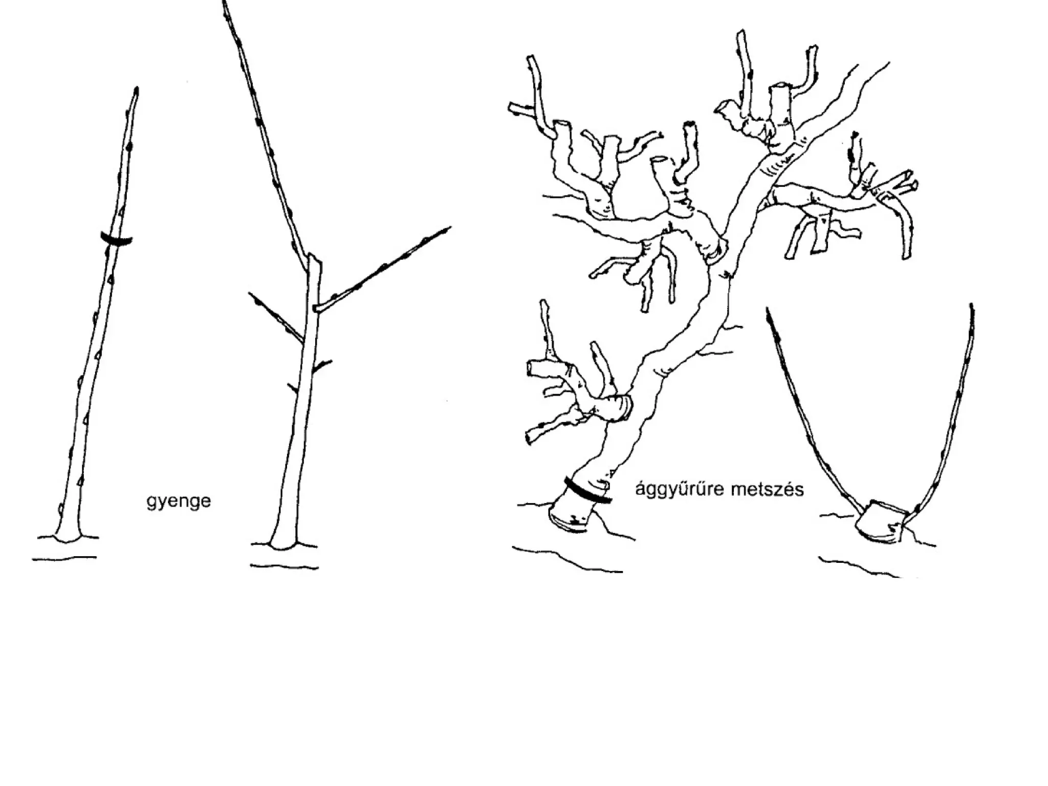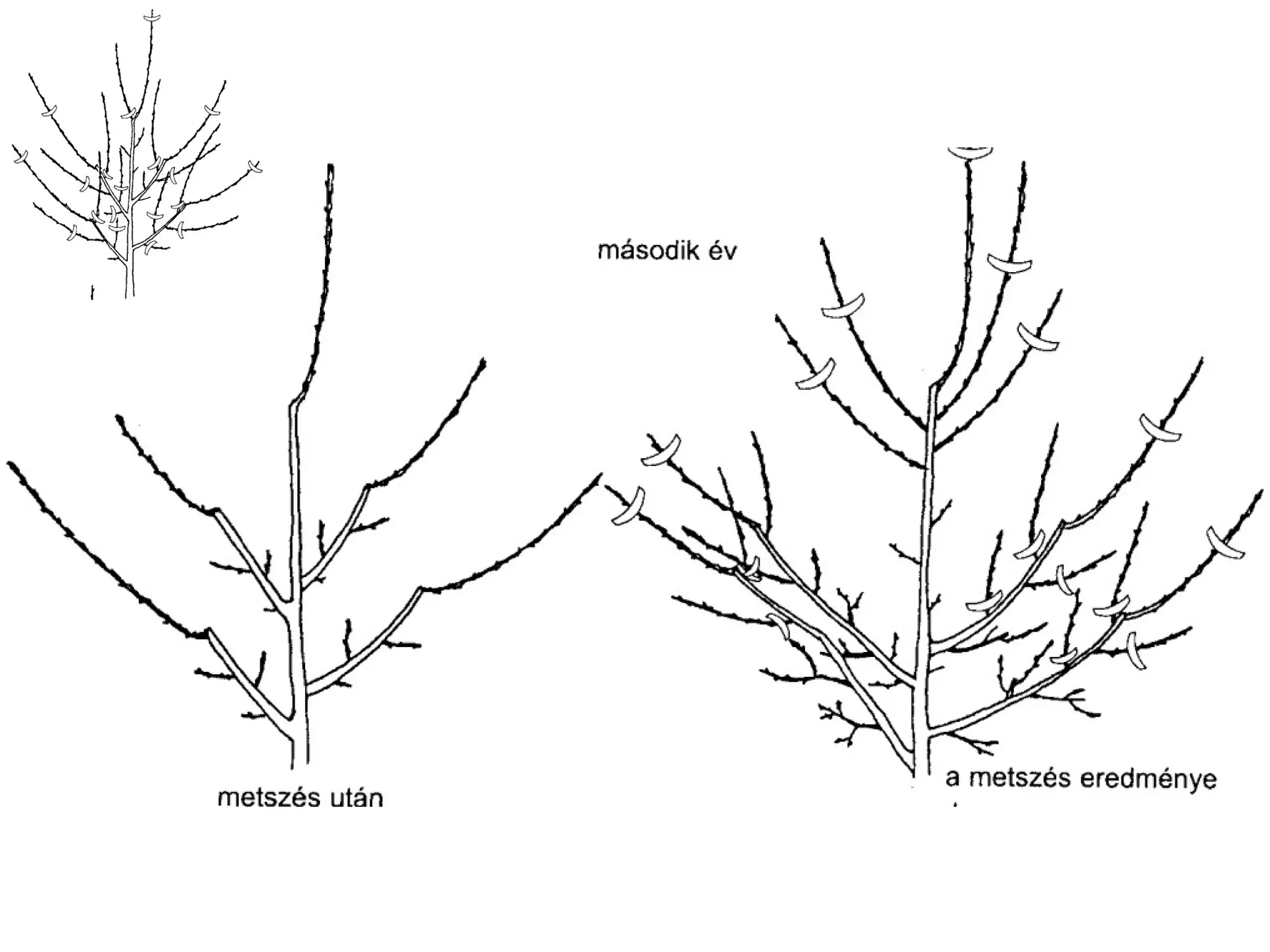 helyzetű, laposabban növő részig történő visszavágással, cél: korona kiterítése, jobb