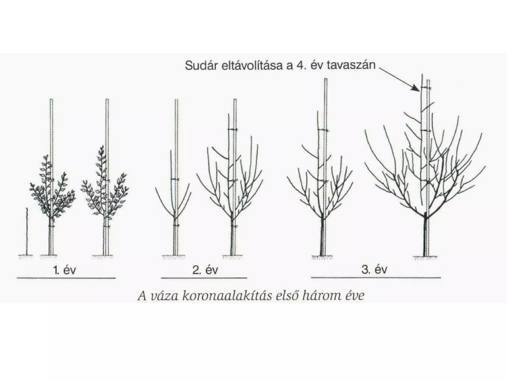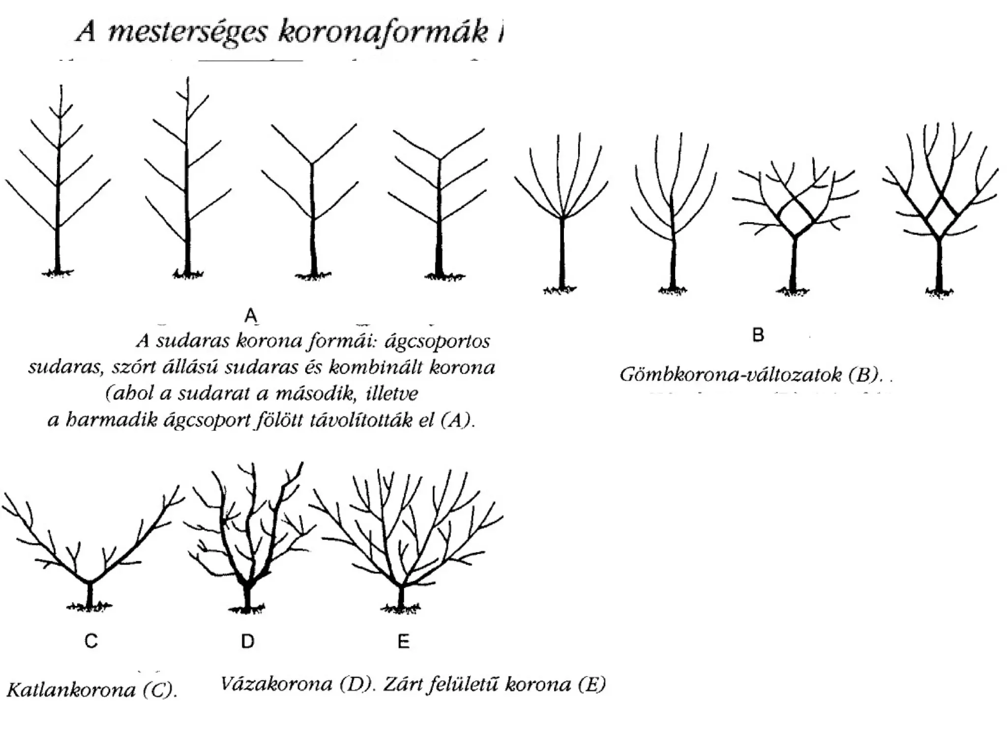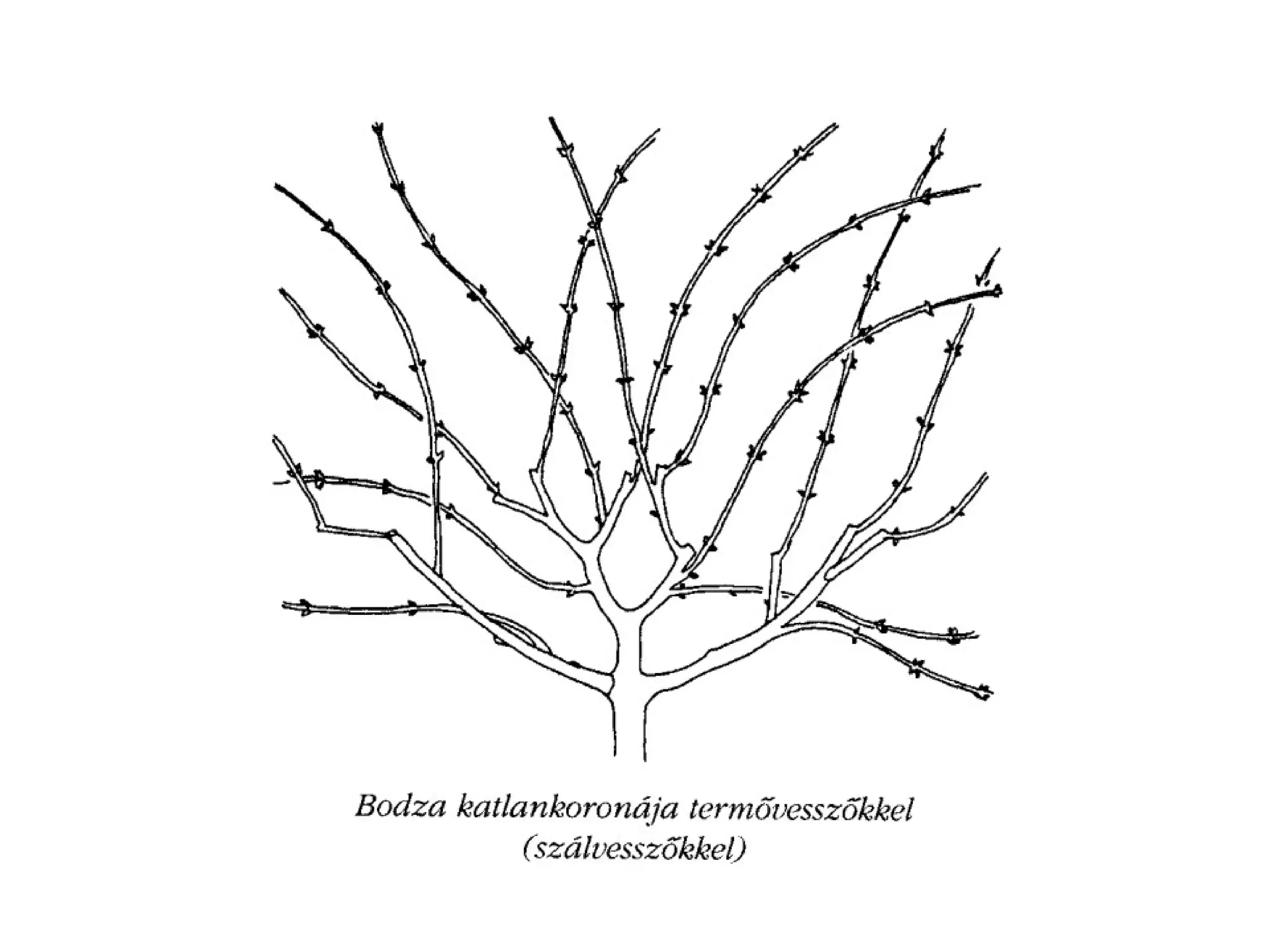 helyzetű, laposabban növő részig történő visszavágással, cél: korona kiterítése, jobb