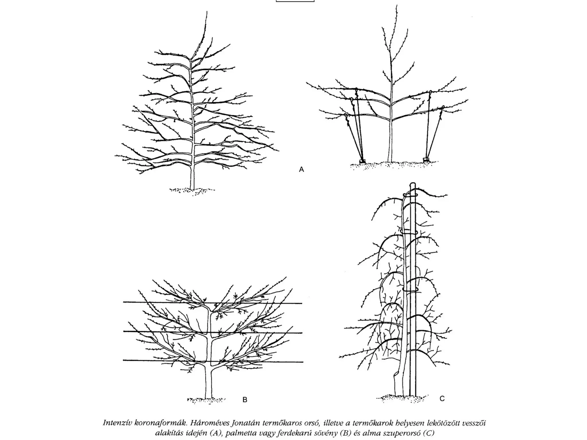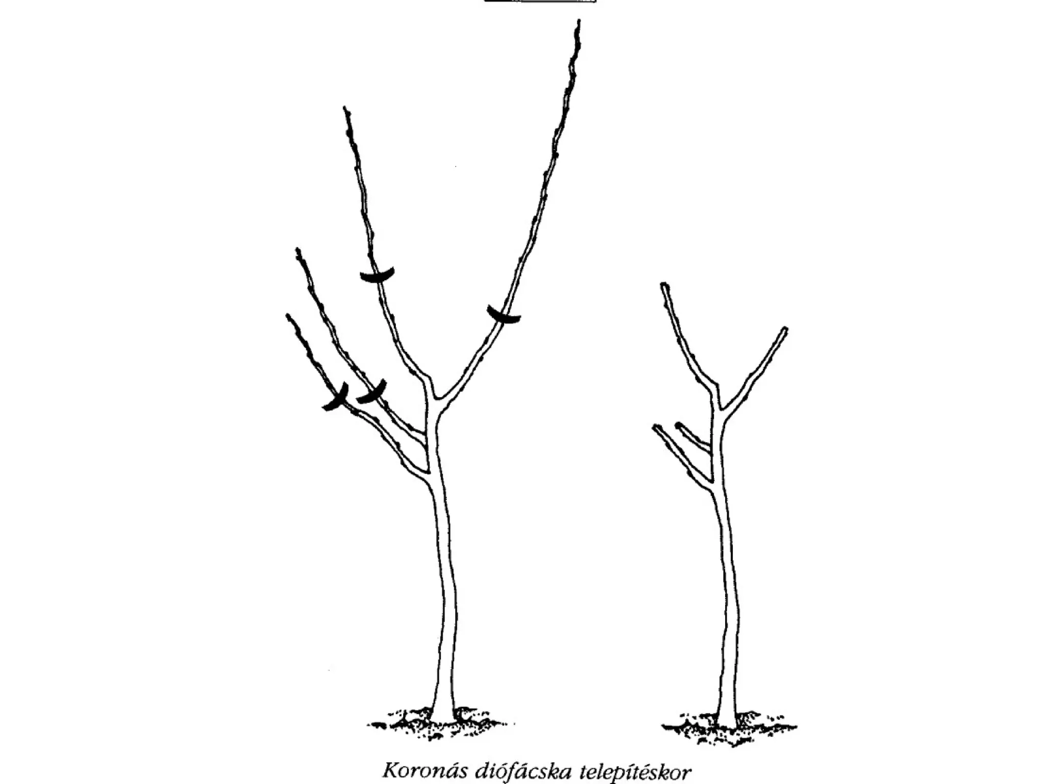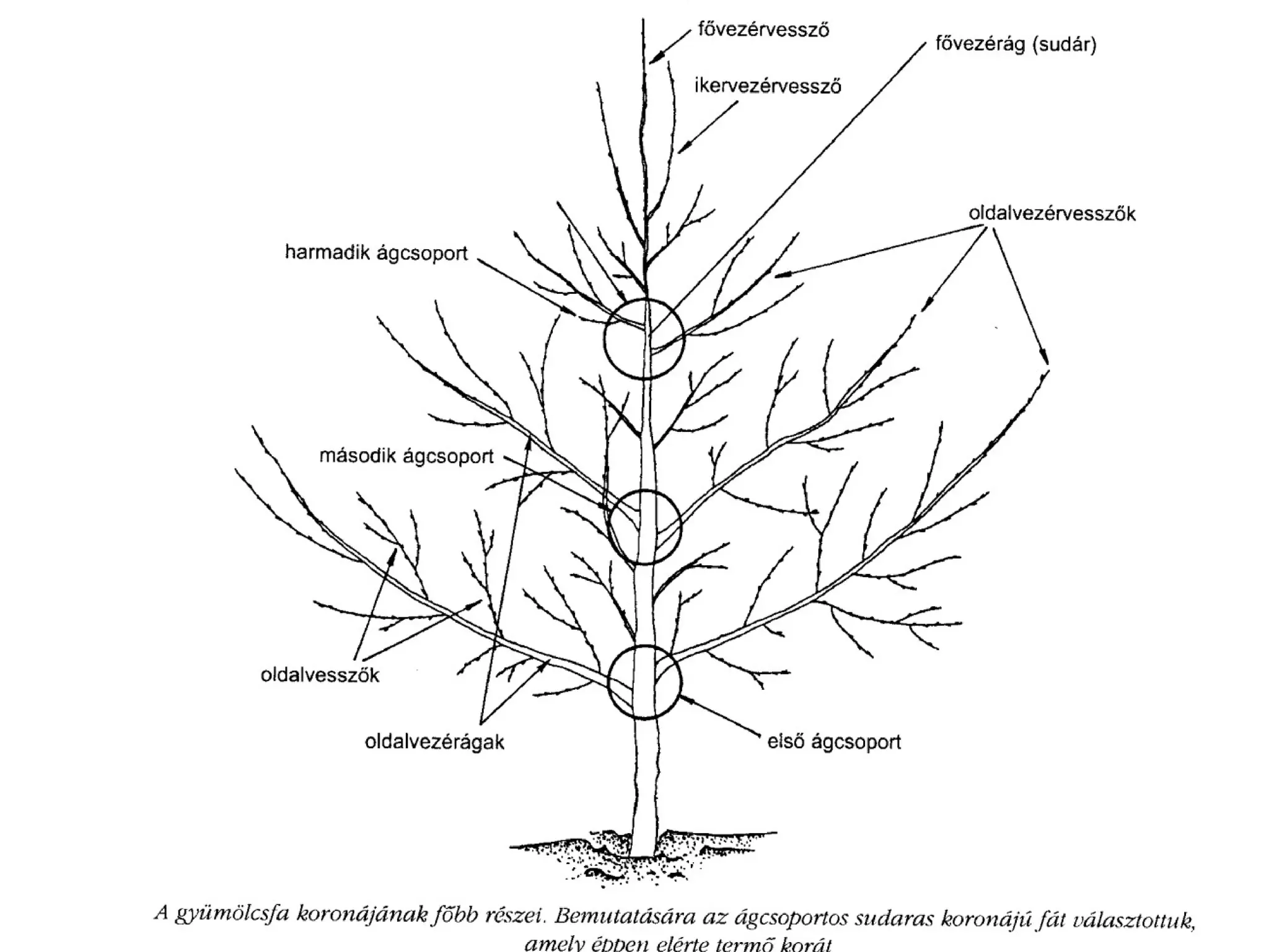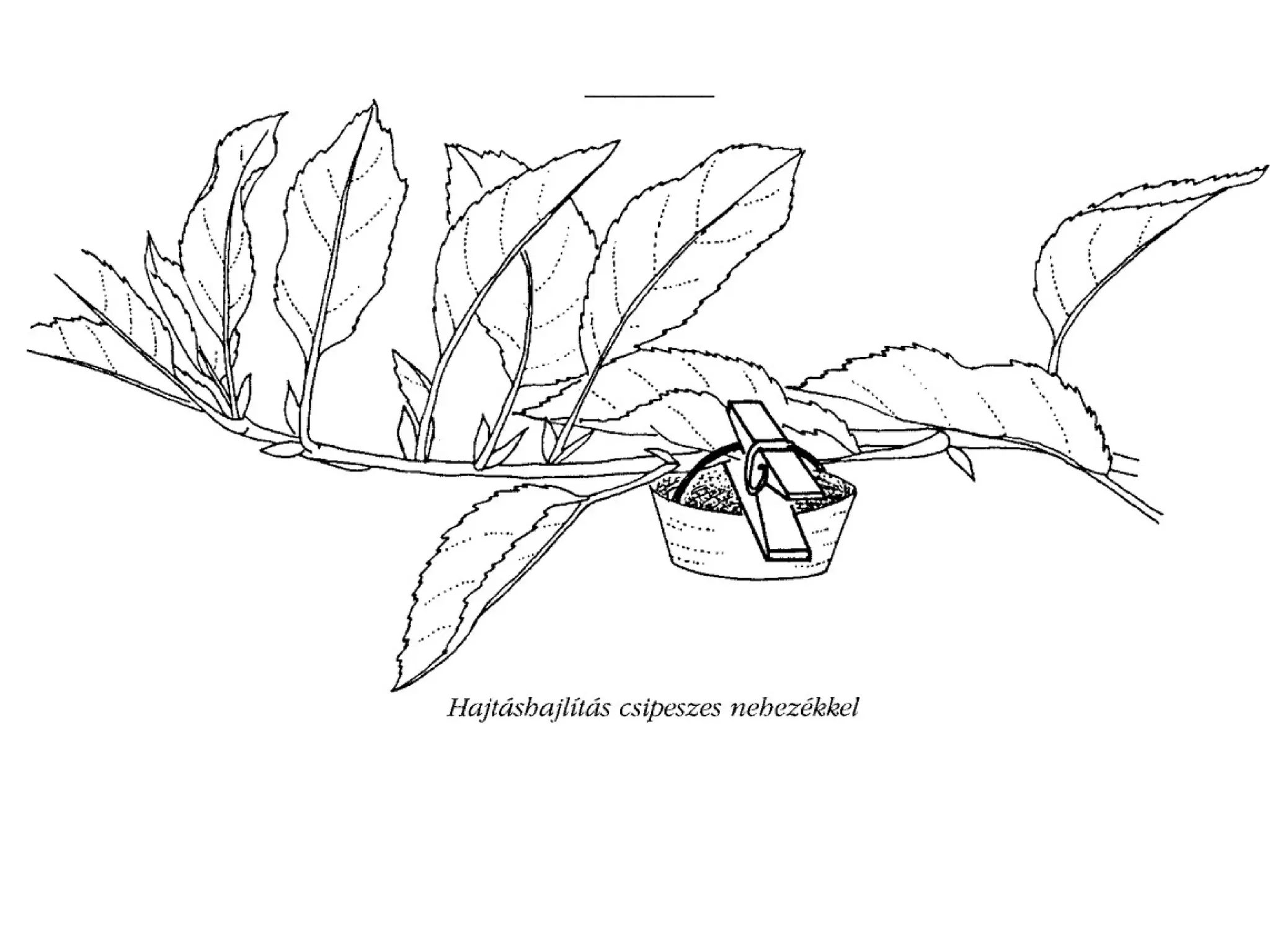 helyzetű, laposabban növő részig történő visszavágással, cél: korona kiterítése, jobb