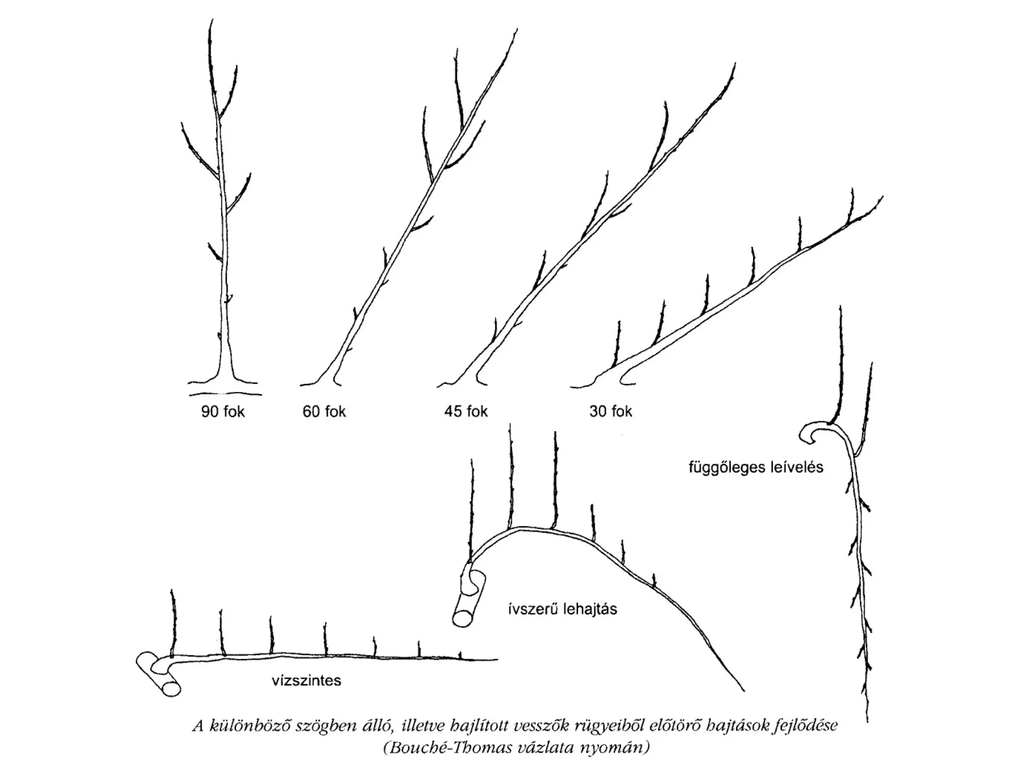 áll, erősen hajt ki, a mögötte lévő rügyből gyengébb, laposabban növő hajtás lesz, a