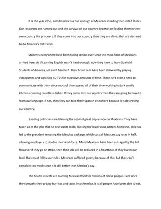 This document portrays a dystopian future in 2050 where Americans blame Mexicans for numerous social and economic issues facing the country. It claims that Mexicans have invaded the US, causing students to fail school due to learning Spanish. Politicians blame Mexicans for job losses leading to a second Great Depression. A new law cuts Mexican wages in half to address unemployment. Health experts blame Mexican food for widespread obesity. Overpopulation makes exercise dangerous and limits farming, causing food shortages and price increases. Paranoia against Mexicans grows as many Americans believe they are conspiring against the country. It warns that if Mexicans cannot be contained, civil war and chaos will ensue.