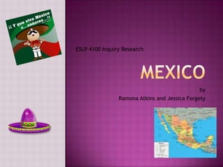 The document is a research paper about Mexican culture written by Ramona Atkins and Jessica Forgety for their ESLP 4100 Inquiry Research course. It discusses what they learned about Mexican history, government, education, transportation and traditions from researching sources like the children's book Off We Go to Mexico! and the encyclopedia CultureGrams. The paper explores various aspects of Mexican culture both past and present through these information sources.
