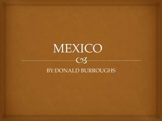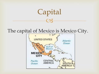 Mexico City is the capital of Mexico and has a population of over 113 million people. It has a varied climate depending on altitude, with tropical areas along the coast and cooler temperatures at higher elevations where Mexico City is located. The government is a federal constitutional republic and most people are Roman Catholic. Common crops include beans and the cuisine features foods like chicken chilaquiles.