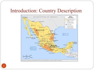 Mexico has experienced a turbulent economic history characterized by periods of prosperity and crisis. In the colonial period, the economy centered around resource extraction and agriculture. Liberal reforms in the 19th century sought to decrease church power and modernize the economy. The Porfiriato regime from 1876-1911 stabilized politics and saw economic growth through foreign investment. The Mexican Revolution from 1910-1920 disrupted the economy. Subsequent governments pursued import substitution industrialization, fueling growth from the 1940s-1970s. Mexico faced debt and financial crises in the 1980s after joining NAFTA and adopting neoliberal policies. Recent reforms have aimed to open the economy further through privatization, boosting growth rates around 2% annually despite challenges from drug