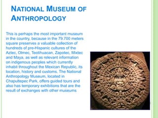 The National Museum of Anthropology in Mexico City houses a valuable collection of artifacts from hundreds of pre-Hispanic cultures such as the Aztec, Olmec, Teotihuacan, Zapotec, Mixtec and Maya, as well as information on current indigenous groups. The Zocalo, or Plaza de la Constitution, in Mexico City contains remnants of pre-Columbian history under the concrete slabs and buildings from colonial Mexico flanking it such as the National Palace and Metropolitan Cathedral. Xochimilco's canals in Mexico City date back around 700 years and are still used as a quiet boat ride today, with vendors, musicians and photographers occasionally approaching other boats.