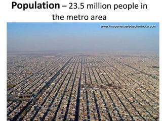 Mexico City has a population of 23.5 million in its metro area. Key landmarks include El Zócalo, the Metropolitan Cathedral, Palacio Nacional, Palacio de Bellas Artes, and Chapultepec Park. The document also discusses Xochimilco, known for its ancient Aztec farming techniques and floating gardens.