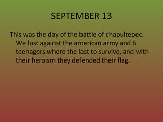 Miguel Hidalgo called for Mexican independence from Spain in Dolores on September 16th, sparking the Mexican War of Independence. Though he was later beheaded, the call expanded and the war began. Today this event is commemorated in town squares across Mexico, especially in Mexico City. On September 13th, Mexico lost the Battle of Chapultepec to U.S. forces, though six teenage soldiers defended their flag heroically. Monterrey, Mexico was founded by Diego Montemayor on September 20th and remained a small trading hub until gaining importance as the capital of Nuevo Leon in the 20th century, experiencing steady growth to the present.