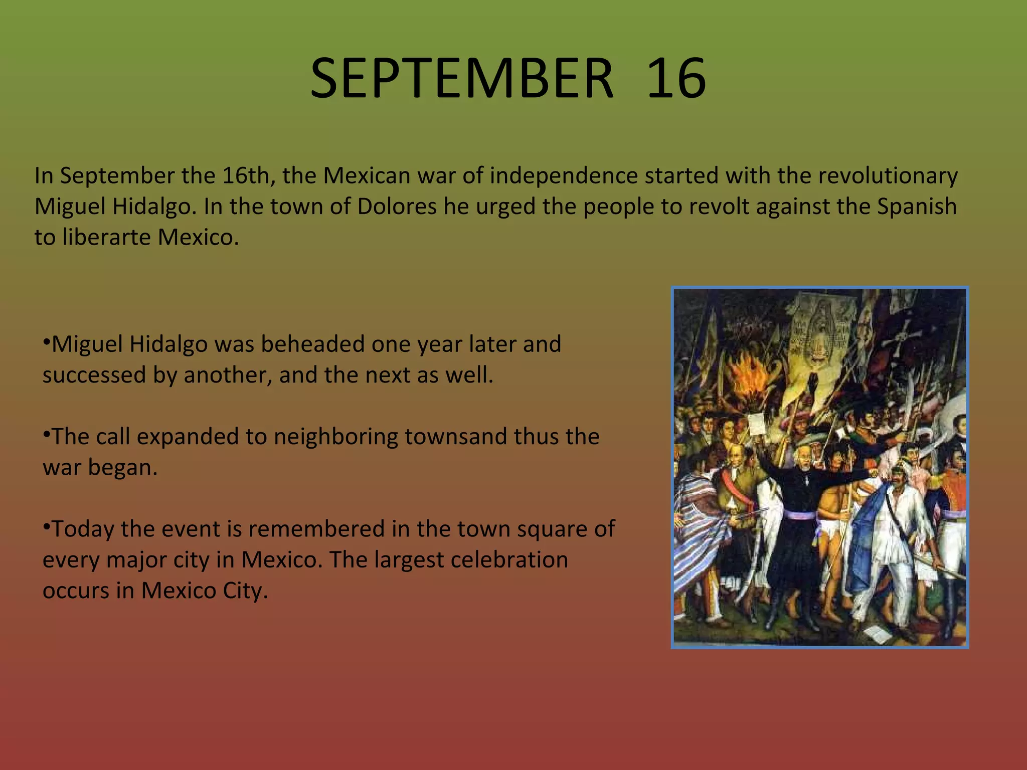 Miguel Hidalgo called for Mexican independence from Spain in Dolores on September 16th, sparking the Mexican War of Independence. Though he was later beheaded, the call expanded and the war began. Today this event is commemorated in town squares across Mexico, especially in Mexico City. On September 13th, Mexico lost the Battle of Chapultepec to U.S. forces, though six teenage soldiers defended their flag heroically. Monterrey, Mexico was founded by Diego Montemayor on September 20th and remained a small trading hub until gaining importance as the capital of Nuevo Leon in the 20th century, experiencing steady growth to the present.