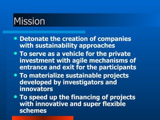 The document describes a proposed "Mexico Nuevo" Trust Fund that would invest in sustainable companies and projects. The Trust Fund would be administered by a technical committee and have at least $10 million USD to invest. Its goals are to promote innovation through sustainable projects, provide financing flexibility, and consolidate sustainable companies that can become self-sufficient over time. The Trust Fund aims to minimize risk and create jobs and economic growth through strategic venture capital investments.