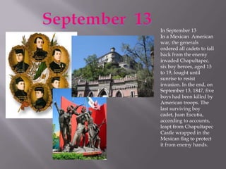 Five Mexican boy cadets aged 13 to 19 fought until sunrise to resist an invasion by American troops in Chapultapec Castle on September 13, 1847. While five boys were killed, the last surviving cadet Juan Escutia leapt from the castle wrapped in the Mexican flag to protect it. Mexico celebrates Independence Day on September 16, commemorating Miguel Hidalgo initiating the independence movement from Spain in 1810. On November 20, Mexico celebrates the anniversary of its Revolution starting in 1910 to overthrow dictator Porfirio Diaz who had seized power after previous rebellions.