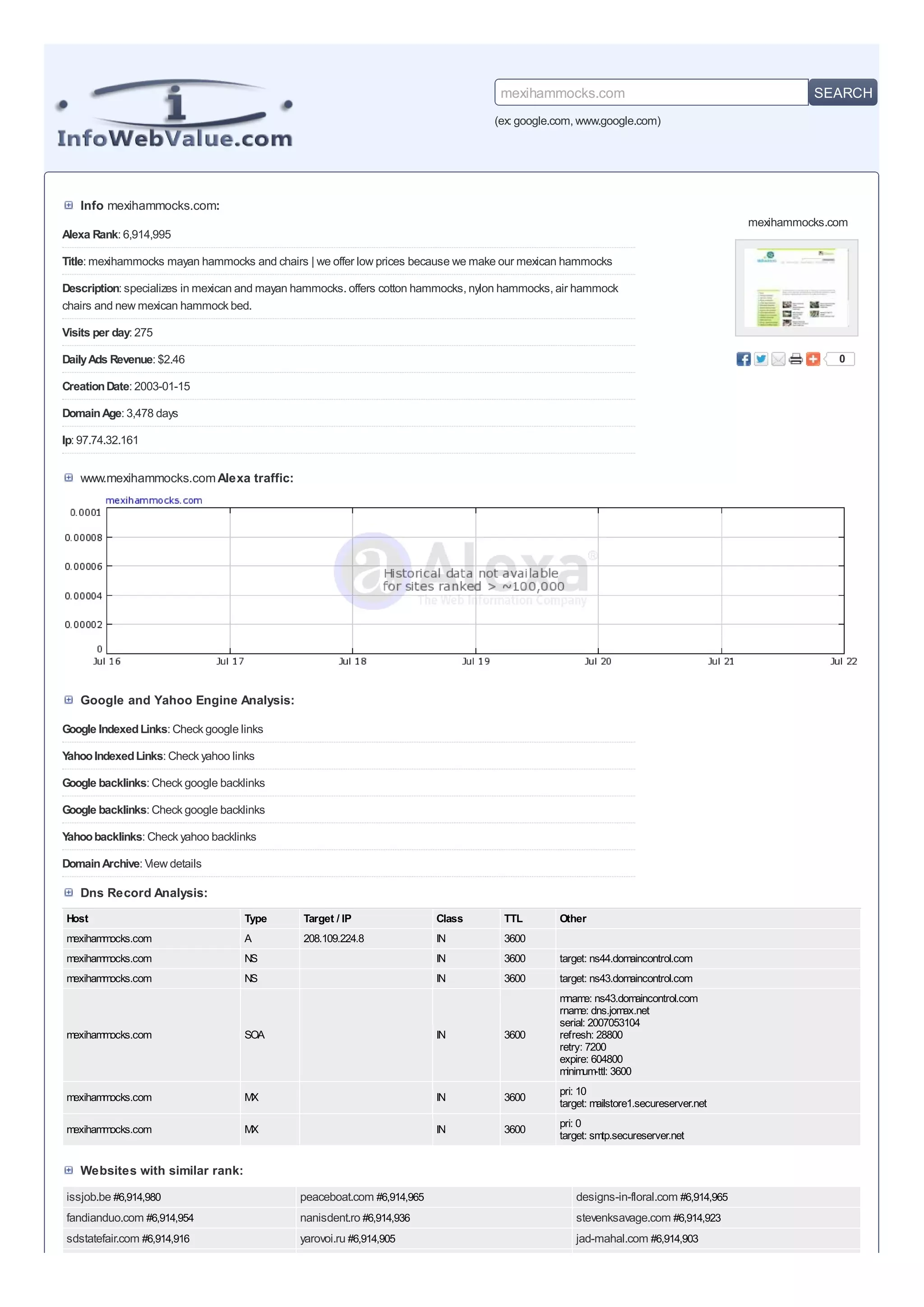 mexihammocks.com is a website that specializes in Mexican and Mayan hammocks. It was created in 2003 and averages 275 visits per day, earning $2.46 in daily ad revenue. The site offers cotton and nylon hammocks as well as air hammock chairs and hammock beds. It has an Alexa ranking of 6,914,995 and is hosted on the IP address 97.74.32.161.