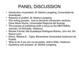 The panel discussion covered various topics related to writing and publishing academic work. Panelists discussed the reasons for publishing, the writing and publishing process, publishing in the MEXTESOL Journal specifically, ethics in publishing, and what to do if an article is not accepted for publication. They emphasized that publishing can further one's career, contribute to their field, and improve writing skills. The process of publishing in the MEXTESOL Journal involves submitting an article, peer review, potential revisions, final editing and proofreading, and publication if accepted. Ethical considerations in research and publishing like informed consent and anonymity were also addressed.
