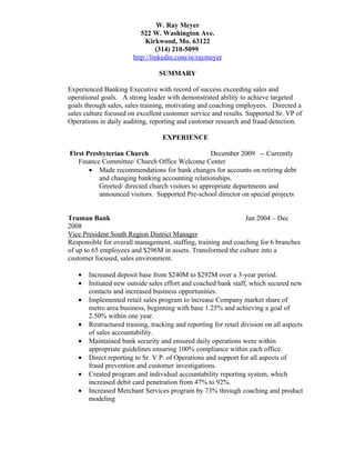 This document provides a summary of W. Ray Meyer's experience as a banking executive, including his roles as Vice President and Branch Manager at various banks over the past 30 years. He has a proven track record of exceeding sales goals and transforming banking cultures to focus on customer service and results. His experience includes managing branches, increasing assets and market share, implementing sales programs, and supporting fraud prevention operations.