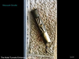 This document contains 21 photos of mezuzah scrolls displayed in various locations throughout Jerusalem and other parts of Israel. The photos show mezuzah scrolls attached to doorways of homes, shops, museums, government buildings and other public spaces. They provide examples of how mezuzah scrolls are used in traditional Jewish areas.