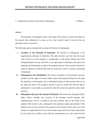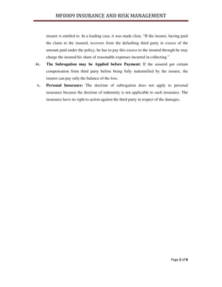The document discusses key concepts in insurance and risk management. It defines subrogation as the insurer's right to stand in place of the insured after a claim is paid to recover costs from alternative sources. It explains the essentials of the doctrine of subrogation, including that it follows the principle of indemnity and substitutes the insurer for the insured's rights up to the amount paid. It also defines indemnity as compensating the insured to the same financial position pre-loss and explains how the contract of indemnity prevents over-insurance and profit from losses.