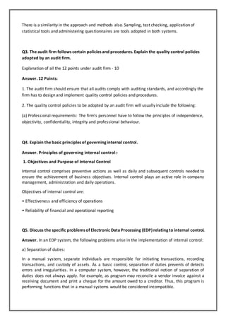This document provides information about assignments available for the MBA Semester 3 course MF0013-Internal Audit & Control. It includes 6 questions related to internal and external audits, quality control policies for audit firms, principles of internal control, problems with electronic data processing systems, and factors for an effective internal control system in banks. Students can get the assignments solved for Rs. 125 each by emailing subjects4u@gmail.com or calling 09882243490. The assignments cover topics such as the differences between government and specific audits, similarities and differences between internal and external audits, quality control policies for audit firms, principles of internal control, issues with EDP systems, and factors for effective bank controls.