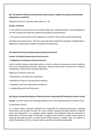 This document provides information about an assignment for an MBA course on Internal Audit and Control. It includes 6 questions related to distinguishing between types of audits, similarities and differences between internal and external audits, quality control policies for audit firms, principles of internal control, problems with electronic data processing related to internal control, and factors for an effective internal control system in a bank. Students are to answer the questions in approximately 400 words each for a total of 60 marks. The assignment can be purchased by emailing or calling the provided contact information for Rs. 125 per question.