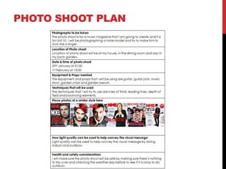 The document summarizes the process of planning a photo shoot and creating the front cover of a magazine. It describes three photo shoots, with the third shoot being selected for the cover. It also discusses designing different masthead concepts, with a bold yellow design being chosen. The summary explains editing the selected cover photo by removing spots and adjusting under-eye colors before placing it on an A4-sized magazine cover alongside the finalized masthead.