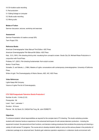 This document provides full subject syllabi for several postgraduate film, television, and computer graphics courses. The CTV 7010 syllabus outlines objectives for a film and video production course that will immerse students in all aspects of production through group projects. Students will learn directing, cinematography, lighting, audio recording, and basic post-production. The CTV 7020 syllabus describes a television studio production course that will enhance directing skills through hands-on experience producing multi-camera TV programs. The CTV 7030 syllabus covers 2D computer graphics workshops exploring concepts, issues, and techniques using software like Photoshop and Illustrator.