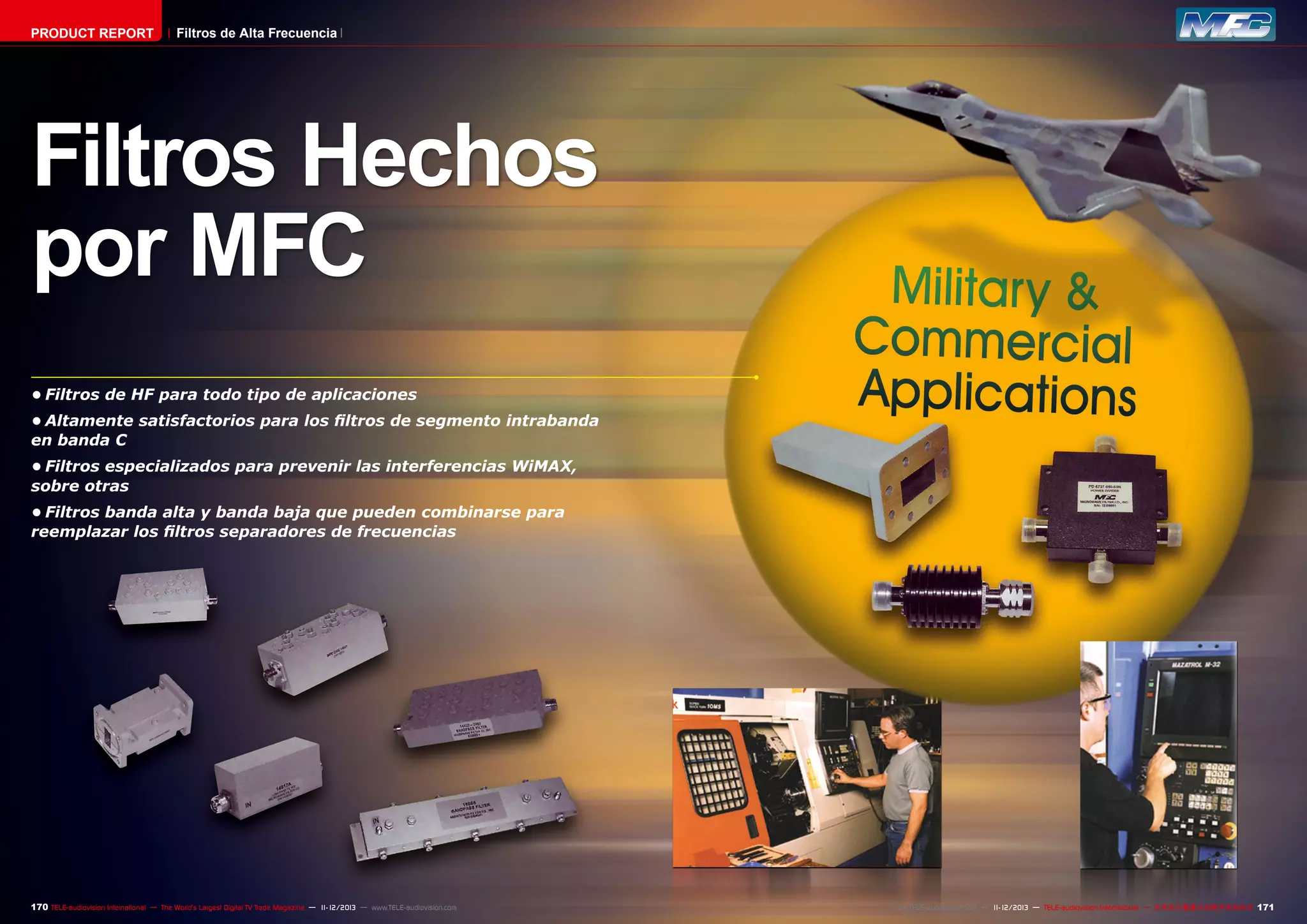 This product report discusses high-frequency filters produced by MFC for applications in the C band. MFC produces various types of filters including band-pass filters to allow only desired frequency ranges to pass through. The report highlights new filters from MFC, including filters designed to eliminate interference from WiMAX and radar signals in the C band. MFC filters are used in satellite reception systems, cable networks, and other applications to block unwanted frequencies and prevent interference between signals.